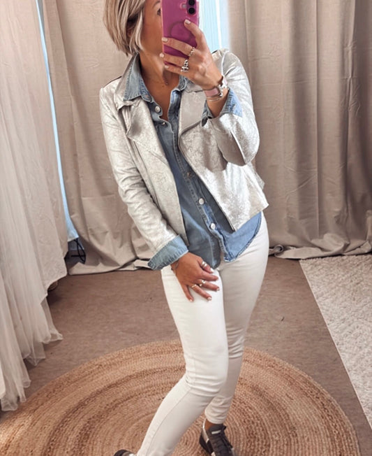 Veste perfecto femme argente leger veste simili cuir metallise argenté