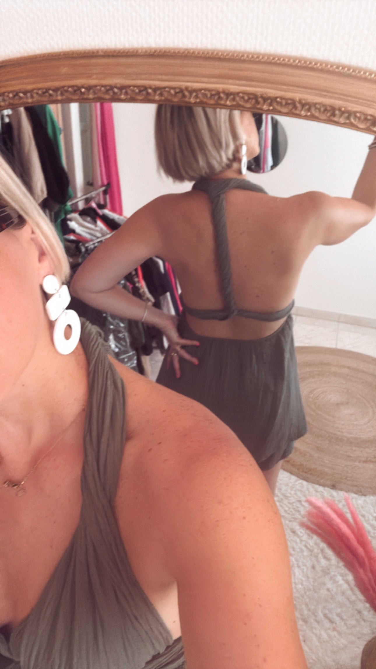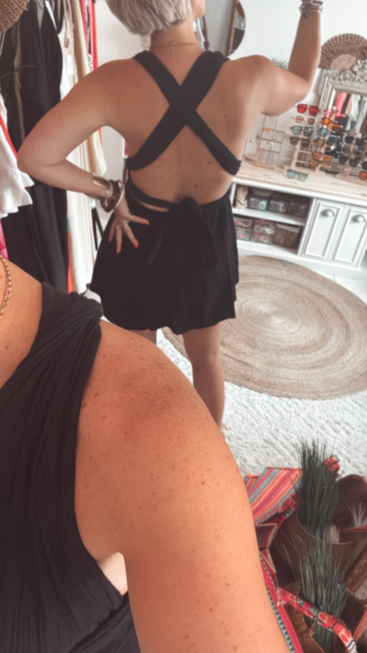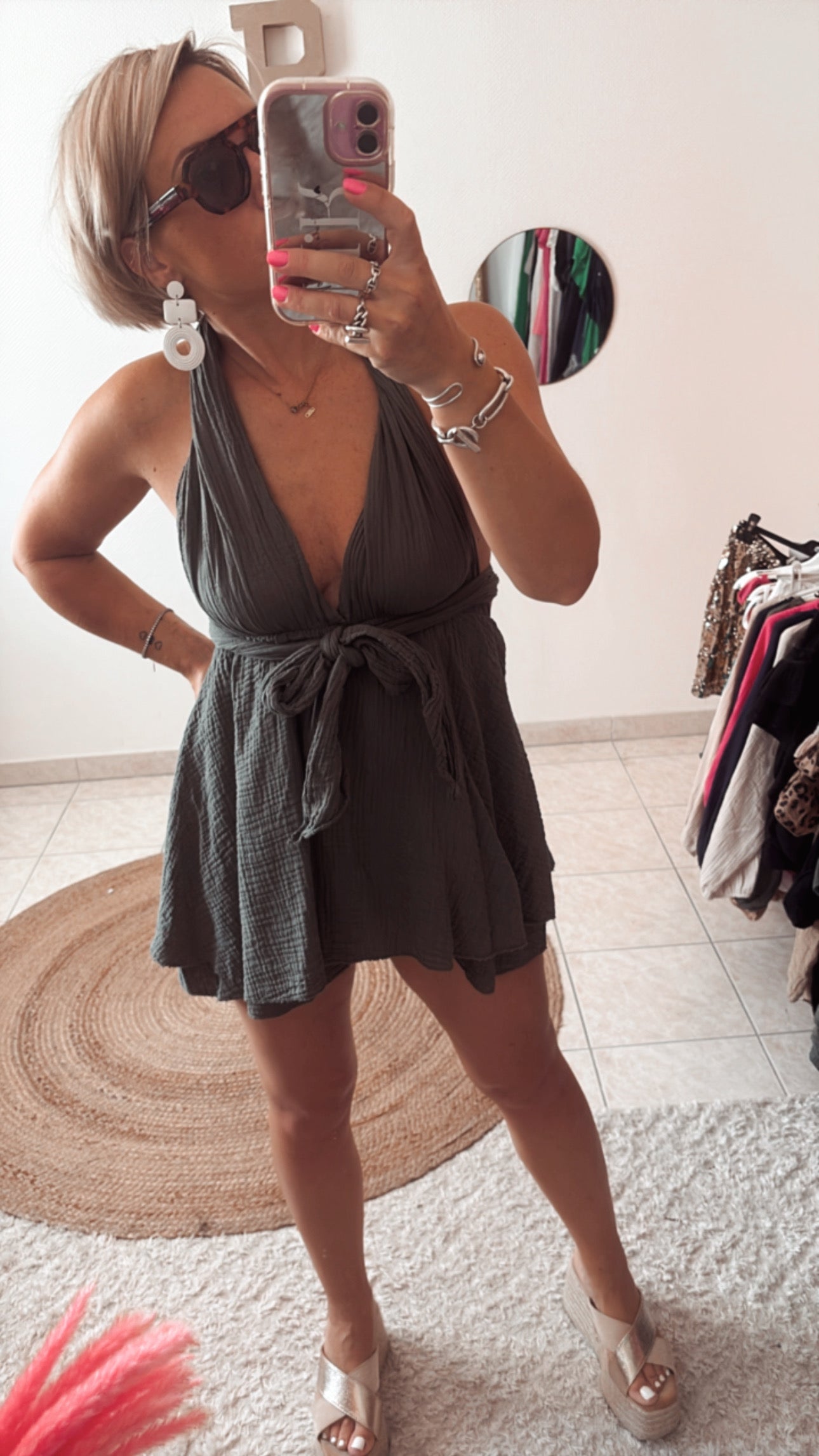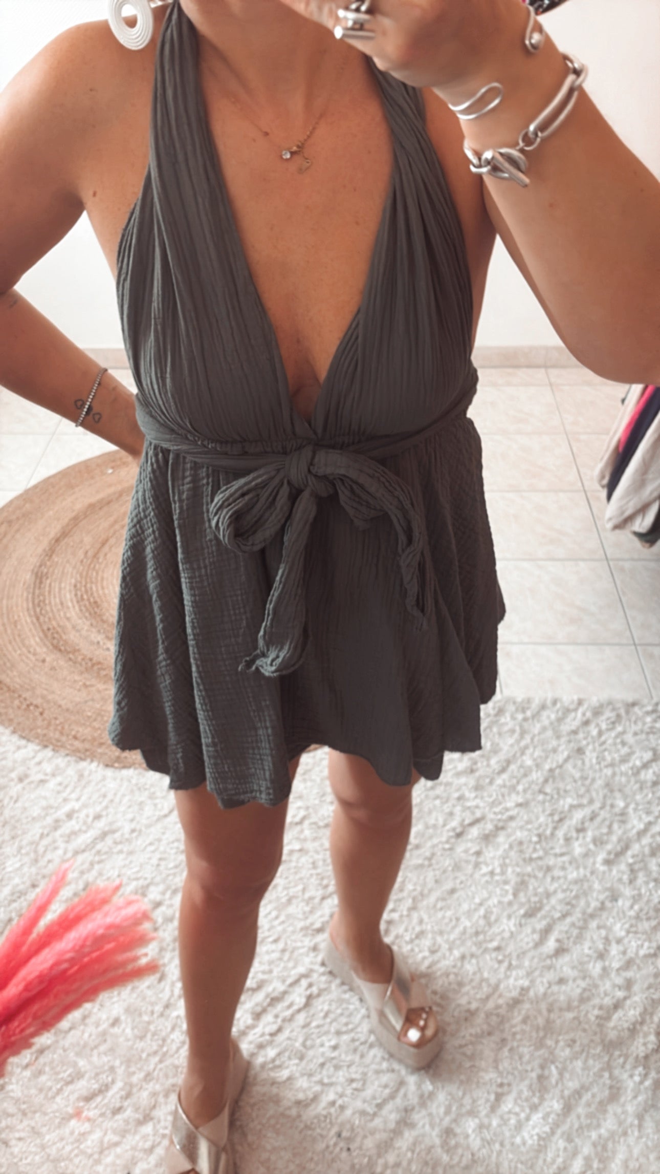 Combishort effet jupe bretelles multi positions en gaze de coton. Élastique à la taille. Taille unique convient du 34 au 42