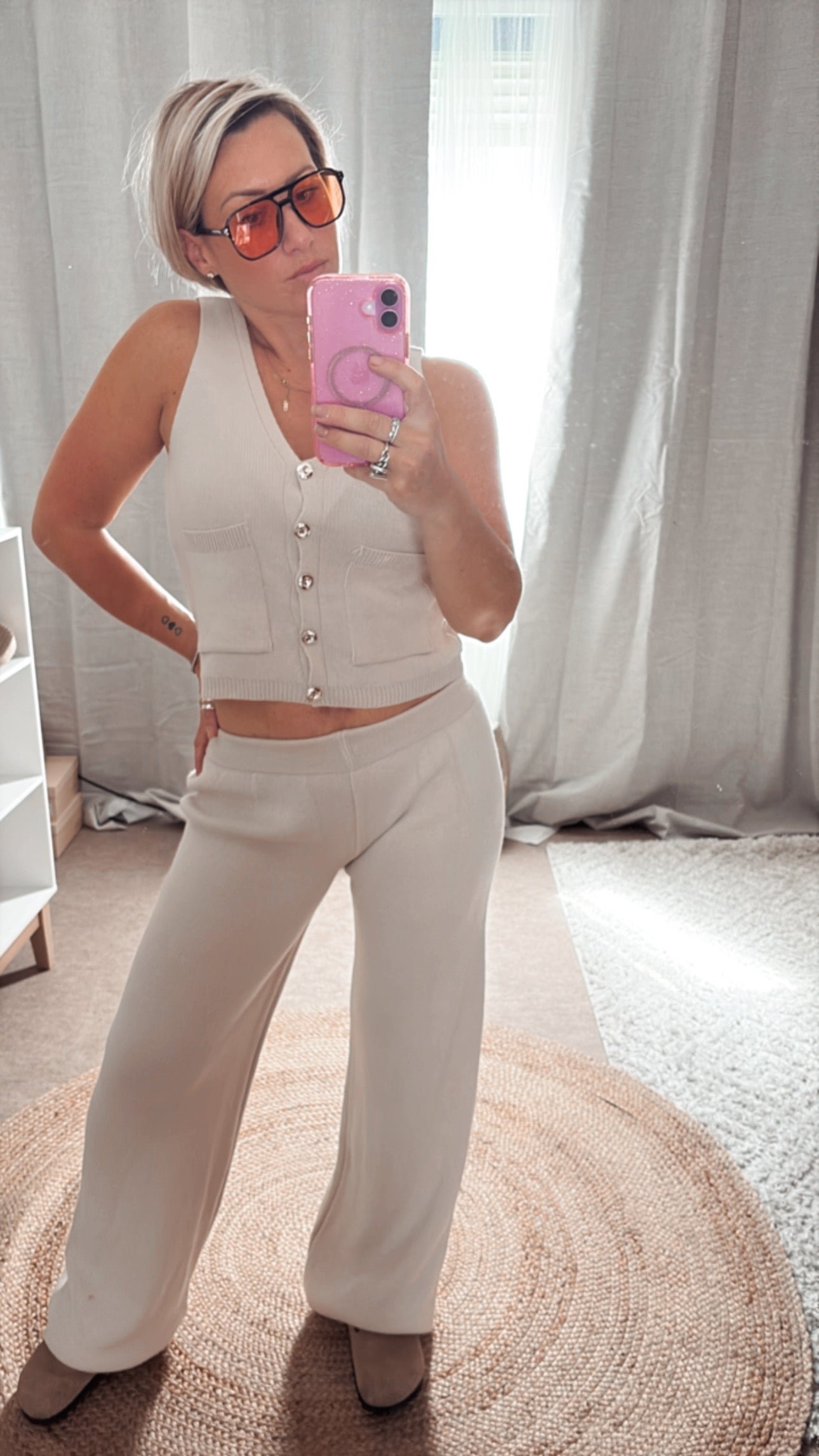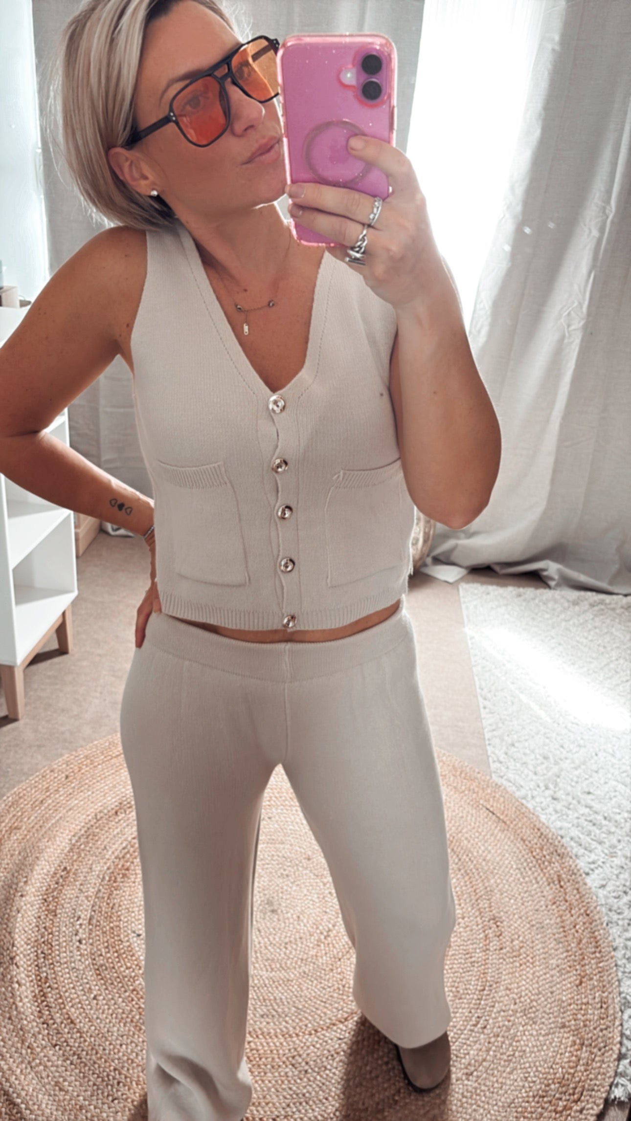 Ensemble en maille pull sans manches boutonnés et pantalon coupe droite.