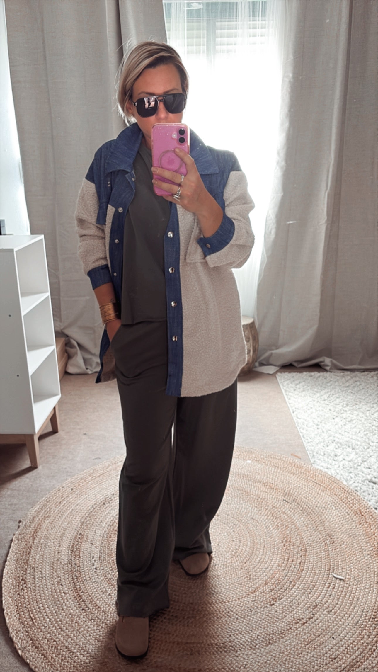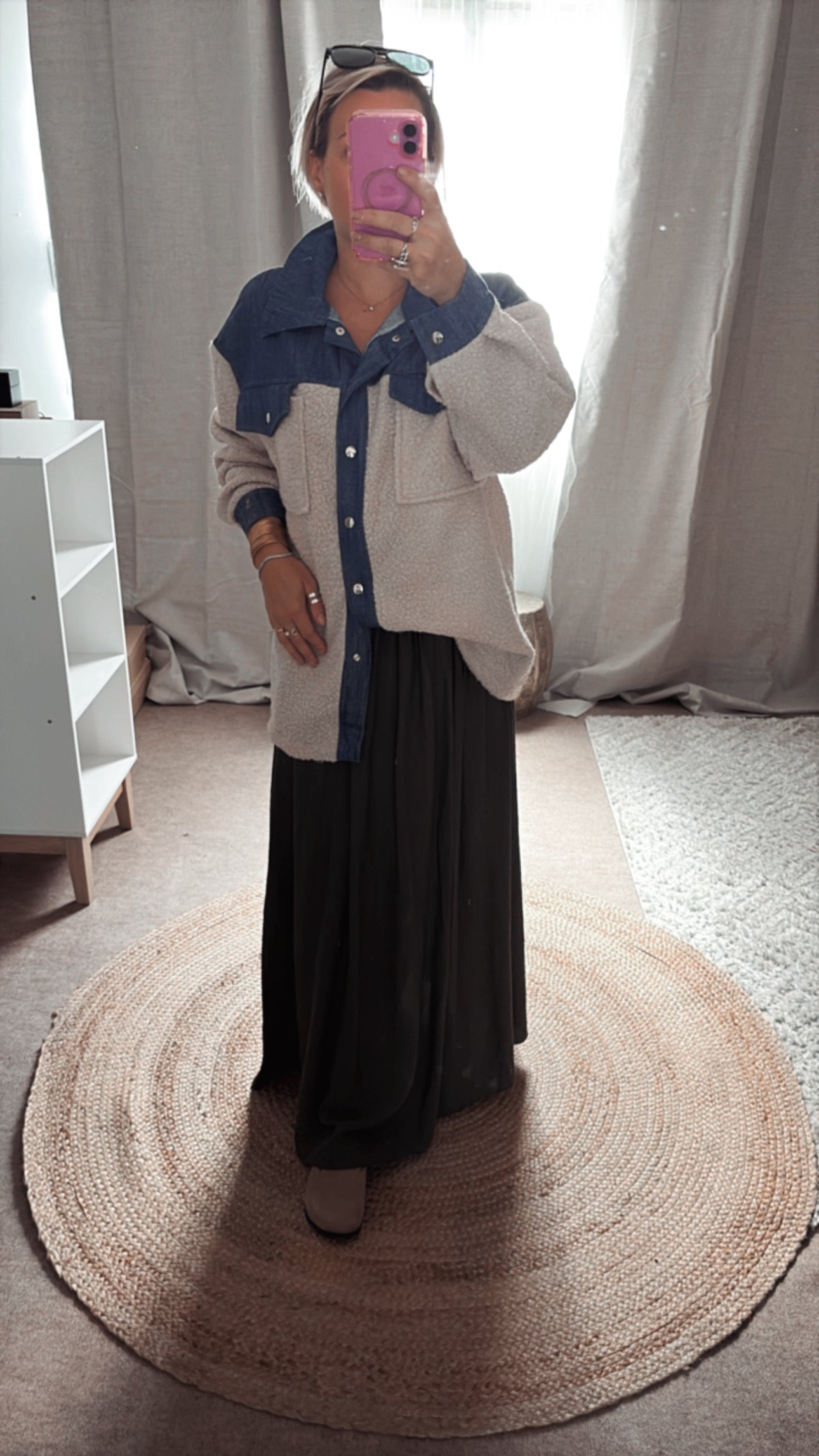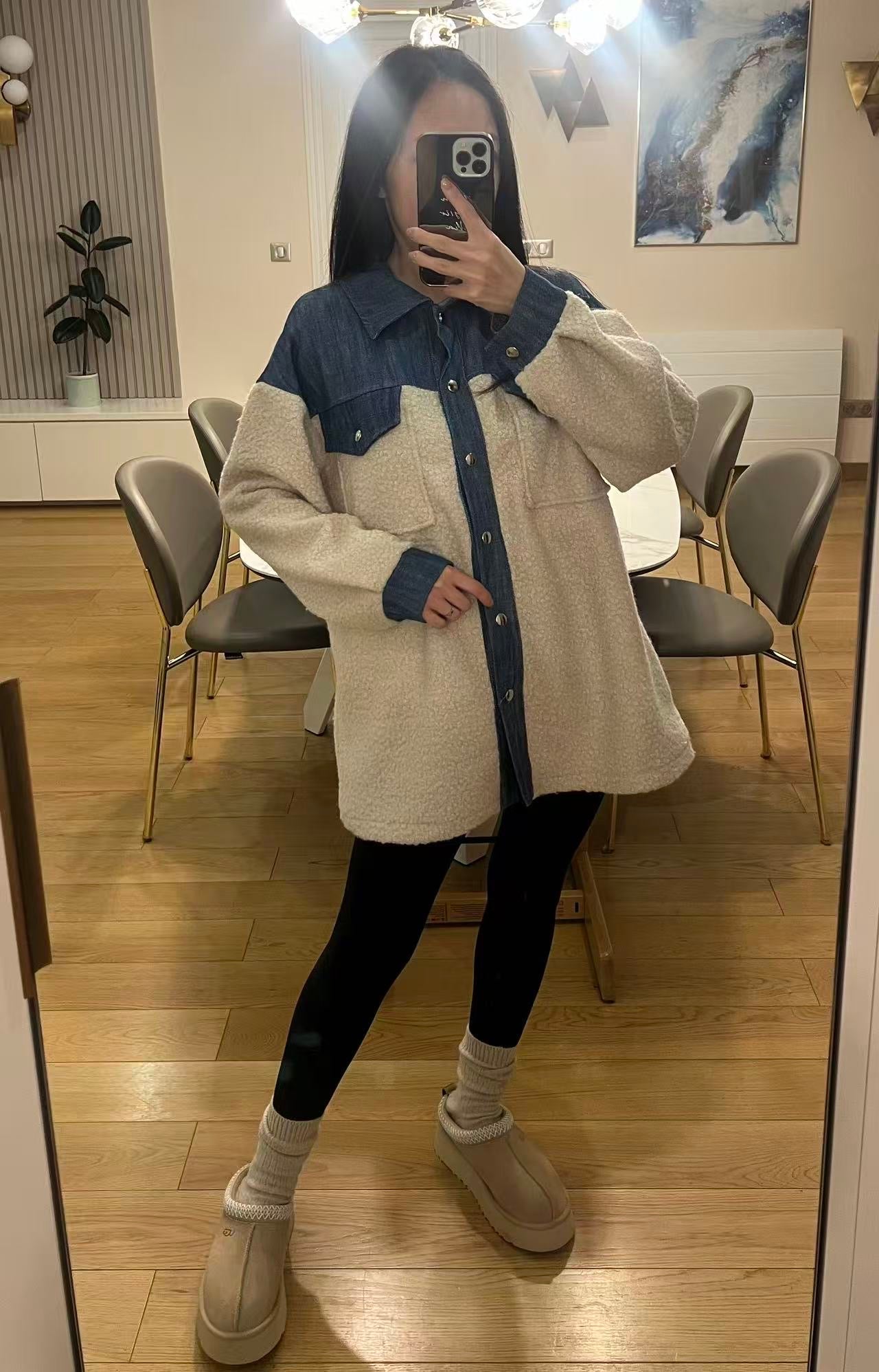 Surchemise ni-matière en bouclette et denim boutonné avec poches