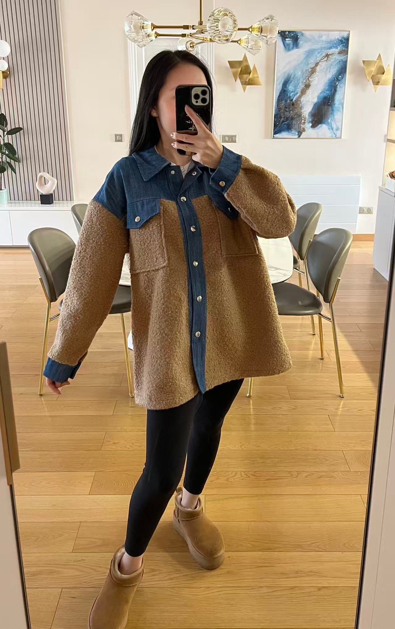 Surchemise En Bouclette Detail Jean beige et Camel